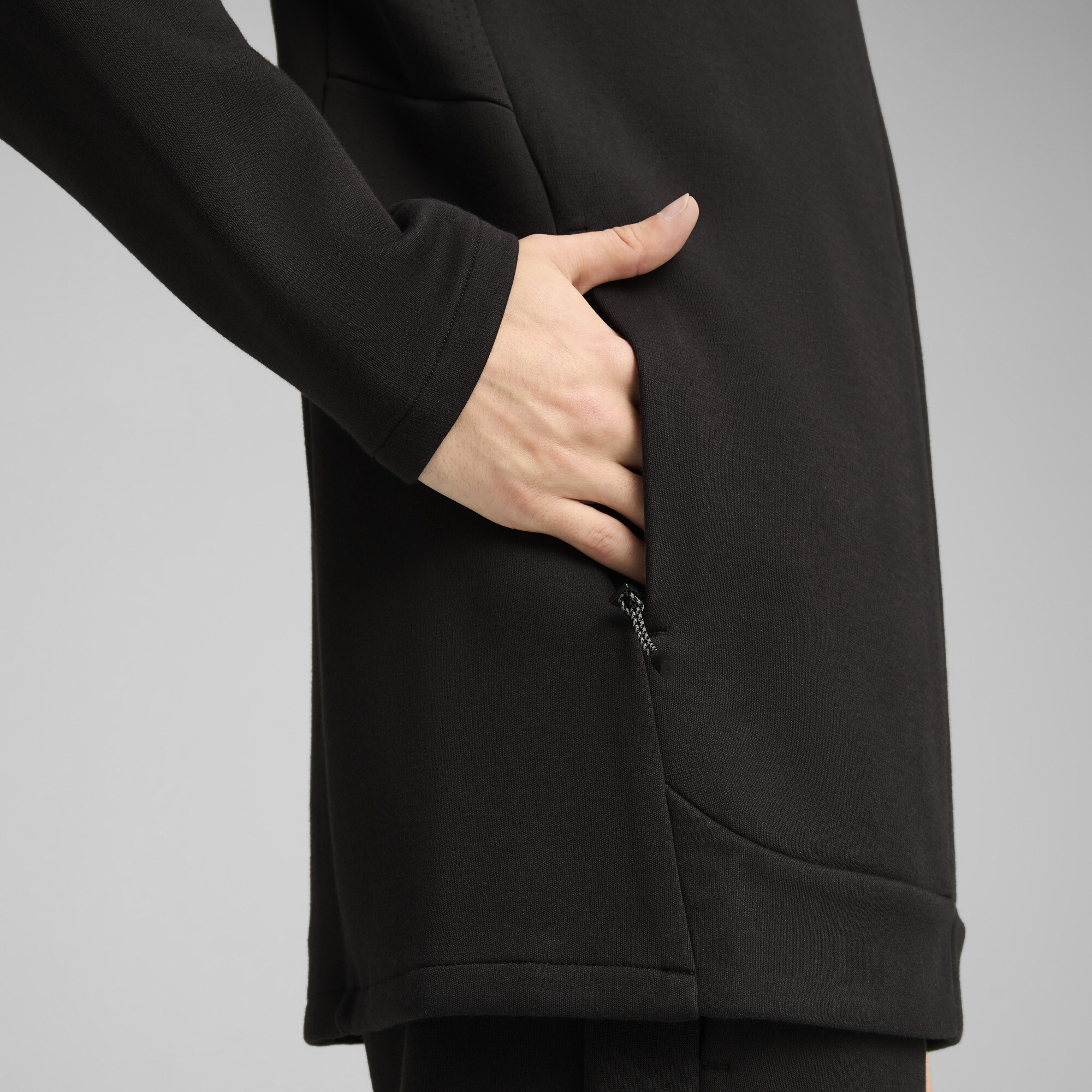 The high collar and fixed hood with reflective drawstring protect you from wind and bad weather, while also adding a stylish touch to your outfit. The zippered side pockets are not only practical but also secure, allowing you to store keys, your phone, and other small items without the fear of losing them. The rubberized PUMA Cat logo on the left side of the chest highlights the dynamic and high-quality nature of the hoodie.