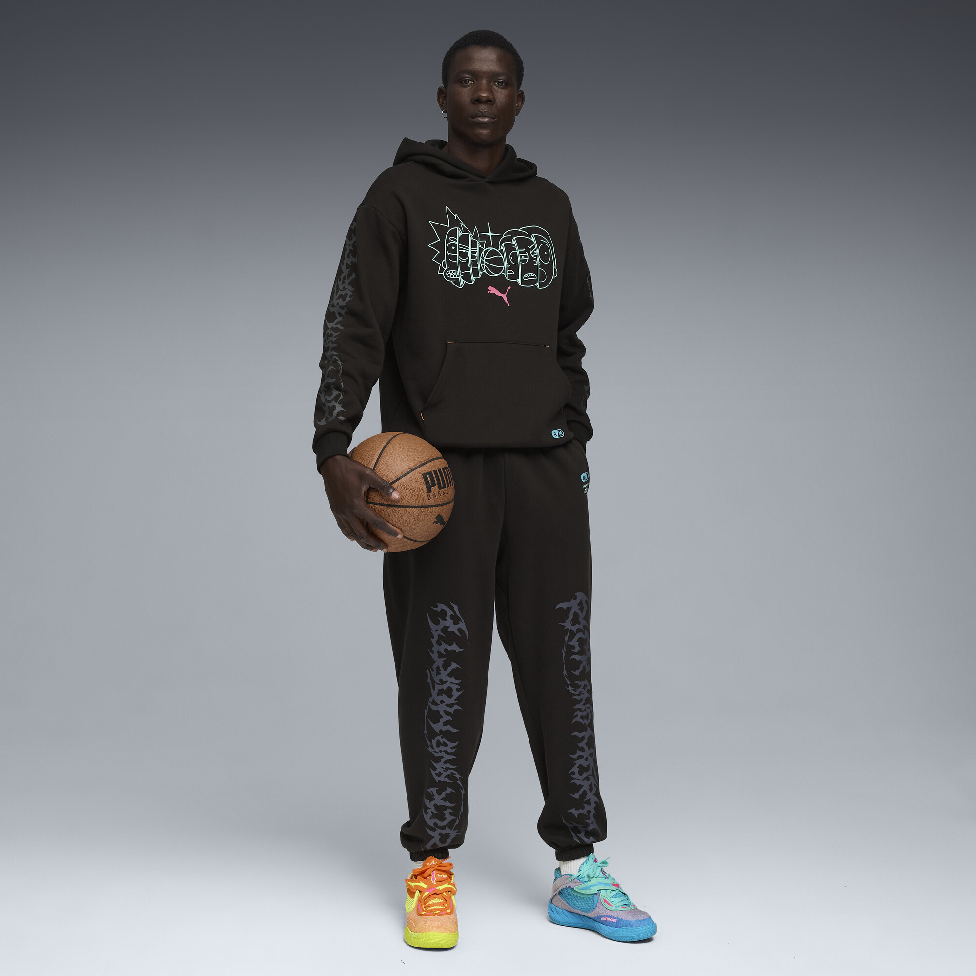 The final touch is the graphics. The PUMA Cat and Rick and Morty logos on the front, as well as the distinctive print on the legs, directly reference the show's multiverse and make the piece part of the recognizable collaborative look.