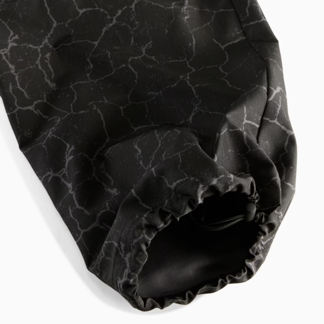 Изготовлены из прочной ткани рипстоп из полиэстера, обеспечивающей долговечность и устойчивость к износу. Свободный крой и стандартная длина создают расслабленный силуэт, а эластичный пояс с внутренним шнурком и эластичные манжеты с утягивающим шнурком гарантируют удобную и регулируемую посадку. Боковые карманы на молнии и сетчатый карман-карго на правой штанине добавляют практичности для хранения мелочей.